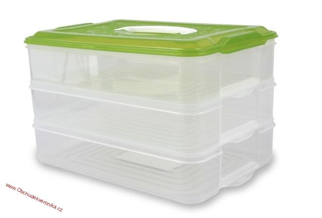 Praktický 3patrový box BUCHTONOŠ o objemu 3 × 3500 ml pro přenášení a skladování cukroví, buchet, koláčů, chlebíčků i občerstvení. Odolný plast, vhodný do myčky, mrazáku i chladničky.