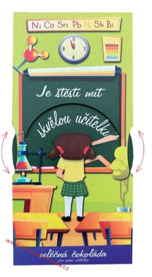 Speciální obal má interaktivní část s otočným kolečkem. Otáčením kolečka na obalu se doplní nápis „Je štěstí mít“ o další text „skvělého učitele“. Obrázek pak vypadá, že jej píše holčička na tabuli a dalším pootočením jej opět smaže. Tento speciální a originální obal dělá z čokolády naprosto dokonalý a netradiční dárek.