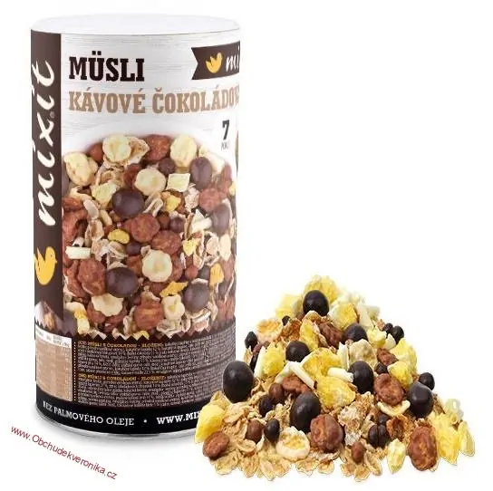 ovesné lupínky, směs čokoládových křupinek (hořká čokoláda 35 % (cukr, kakaová hmota, kakaové máslo, emulgátor: lecitiny; přírodní vanilkové aroma),