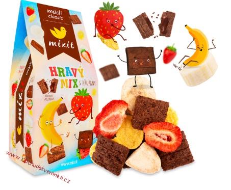 Snídaně bude odteď zábavou i pro ty nejmenší Mixiťáky! Právě pro ně jsme totiž s láskou namixovali tento Hravý mix. :-) Na hrstech cornflaků dovádí naši veselí Křupani - Jahůdka Pohůdka, Pan Banán a kakaový Pan Polštářek. Tahle parta spolehlivě dodá našim broučkům potřebné vitamíny a snídani ten správný šmrnc, který navodí bezstarostnou náladu i dospělákům. :)
