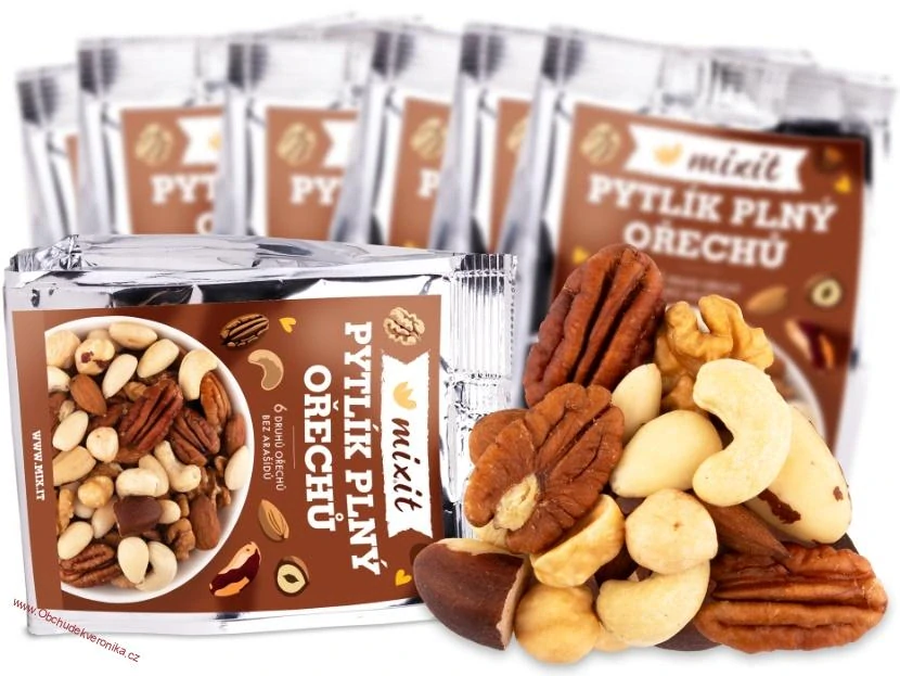 Pytlík plný ořechů tak, jak je příroda stvořila. Nekompromisně dobré bez čehokoliv navíc. 6 druhů ořechů, nově bez arašídů, potěší všechny, kteří se řídí heslem „hlavně přirozeně“. :-) Para ořechy, kešu, mandle, vlašské, lískové a pekanové ořechy. Dokonalá souhra chutí doplní energii a bílkoviny v práci, ve škole i na výletě.